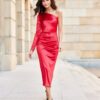 Midi dress with one long sleeve with a subtle slit at the leg is made of delicate satin fabric, which nicely adapts to the figure. On the side there is a crease, which perfectly conceals any imperfections. The original cut with one sleeve gives it a unique character. Fastened with a covered zipper on the side of the dress. This midi dress is not only elegant, but also functional. The midi length gives the dress a refined, feminine style. This dress cut will allow you to feel original by emphasizing your individual style and is sure to attract attention by making you stand out from the crowd regardless of the occasion. The product is made and sewn in Poland.