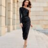 Midi dress with one long sleeve with a subtle slit at the leg is made of delicate satin fabric, which nicely adapts to the figure. On the side there is a crease, which perfectly conceals any imperfections. The original cut with one sleeve gives it a unique character. Fastened with a covered zipper on the side of the dress. This midi dress is not only elegant, but also functional. The midi length gives the dress a refined, feminine style. This dress cut will allow you to feel original by emphasizing your individual style and is sure to attract attention by making you stand out from the crowd regardless of the occasion. The product is made and sewn in Poland.