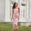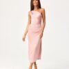 One-shoulder midi dress with a subtle slit at the leg is made of delicate satin fabric. On the side there is a crease, which perfectly conceals any imperfections. A wide shoulder strap with creases on one shoulder gives it a unique character. Fastened with a covered zipper on the side of the dress. This midi dress is not only elegant, but also functional. The midi length gives the dress a refined, feminine style. This dress cut will allow you to feel original by emphasizing your individual style and is sure to attract attention by making you stand out from the crowd regardless of the occasion. The product is made and sewn in Poland.