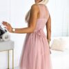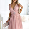 Feminine tulle dress with neckline and decorative buckle. The back of the dress was sewn from elastic gumonit, so it will fit most sizes. The dress comes in the color of dirty pink. Brand numoco basic. European product.