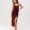 Holly is an elegant midi dress model with delicate straps that subtly accentuate the shoulders and back. The loosely falling, classic neckline adds style and elegance. The sexy slit on the leg and draping on the upper part of the skirt will make you feel exceptionally feminine. Additionally, the dress is equipped with a decorative rose element that can be used in many ways – tied at the waist, neck, wrist, or as a handbag decoration. It is fastened at the back with an invisible zipper. The brocade dress Holly is an incredibly eye-catching model that does not require additional accessories to make an impression. The carefully considered cut perfectly accentuates the feminine silhouette. Paired with high-heeled suede boots, it creates a unique look that is perfect for special occasions such as holidays, New Year’s Eve, or evening club outings. The product is manufactured and sewn in Poland.