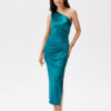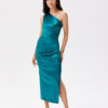 Satin midi dress with one shoulder. The top is asymmetrical with ruching on the shoulder, and the bottom is straight, with a slit on the leg. It does not have a lining, and is fastened with a zipper.