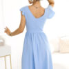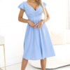 This beautiful, blue midi dress is the quintessence of feminine style and comfort. The wrap V-neck subtly highlights the bust, while the short, butterfly sleeves add lightness and romantic charm. The waist is accentuated by a wide belt that beautifully shapes the silhouette, and the flared bottom of the dress perfectly adjusts to every movement, ensuring lightness when worn. The dress is fastened with a concealed zipper at the back, so it fits perfectly on the body.