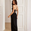 Aria is a unique dress that harmoniously combines a modern character with classic femininity. Made of high-quality, delicately shimmering material, it subtly envelops the silhouette, emphasizing its natural lines. Thin straps, a plunging neckline, and a fitted cut create a sensual yet elegant form. At the back, attention is drawn to the deep neckline adorned with a corset lacing, not only a spectacular but also a practical solution, allowing for a perfect fit. Additional gathering at the waist shapes the figure, and a slit on the leg adds lightness and grace to the entire styling. It is a perfect choice for special occasions from weddings, through romantic dinners, to elegant evening outings. Aria ensures comfort thanks to careful construction and high-quality finishing, while delighting with every detail. Choose Aria if you are looking for a creation that subtly attracts attention and emphasizes the uniqueness of the moment, with class and sophistication. Designed and made in Poland.