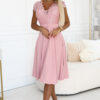 The enchanting, feminine dress with a lace top and flared bottom is a perfect choice for weddings, receptions, and special occasions. The top made of delicate lace with short sleeves beautifully emphasizes the neckline, while the bottom made of flowing fabric subtly accentuates the waist and adds lightness to the entire outfit. The romantic color of powdery pink enhances the beauty and adds charm to every woman. The dress will work perfectly as an outfit for a wedding, communion, date, or elegant outing.
