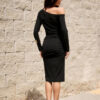 Model Noemi is a women’s midi dress with an eye-catching cut, a sensual one-shoulder neckline beautifully accentuates the shoulders, and subtle draping on the side adds lightness to the whole. Made of high-quality, elastic fabric, it perfectly fits the silhouette and provides full comfort when worn. Made in Poland with attention to every detail, it stands out for its durability and meticulous finish. It is an ideal proposition for elegant receptions, romantic dinners, or evening outings, especially when combined with classic heels or trendy sandals.