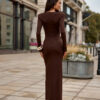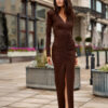 Midi dress with a particularly feminine cut, with a long slit at the front, which adds lightness and a sensual character. Made of high-quality fabric, a combination of viscose, elastane, and nylon, it perfectly fits the silhouette, providing comfort when worn. The V-neck beautifully emphasizes the neckline, and the delicate gathering at the front visually shapes the figure. Long sleeves and shoulder pads give the dress an elegant, modern look. The dress was designed and made in Poland, guaranteeing the highest quality of workmanship and attention to every detail. Ideal for special occasions and evening outings, just choose the right accessories to create a stylish and classy outfit.