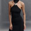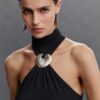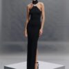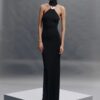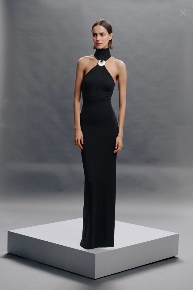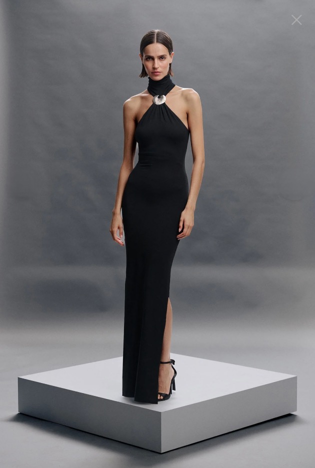 Αναδείξτε την κομψότητά σας με αυτό το εντυπωσιακό μαύρο halter maxi φόρεμα με high-neck σχεδιασμό. Η μεταλλική statement λεπτομέρεια στο μπούστο χαρίζει ένα μοναδικό, premium touch, ενώ η εφαρμοστή γραμμή αγκαλιάζει το σώμα και κολακεύει τη σιλουέτα.