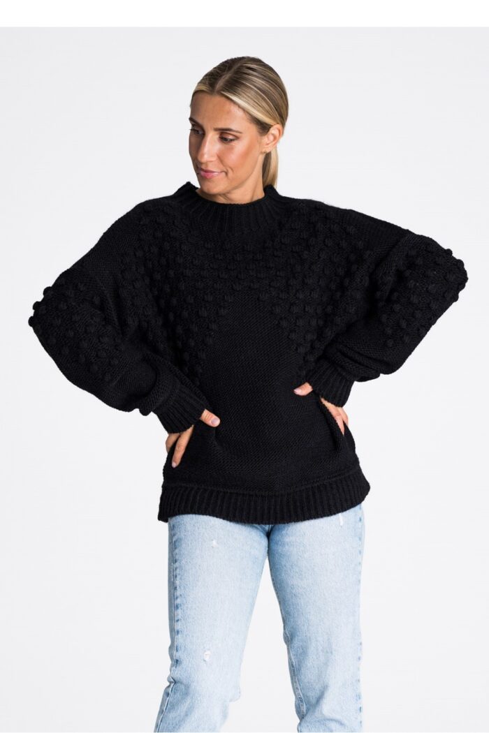 Sweater with long sleeves. The front of the sweater decorated with small pom-poms. Bottom, neckline and sleeves of the sweater finished with elastic ribbing.