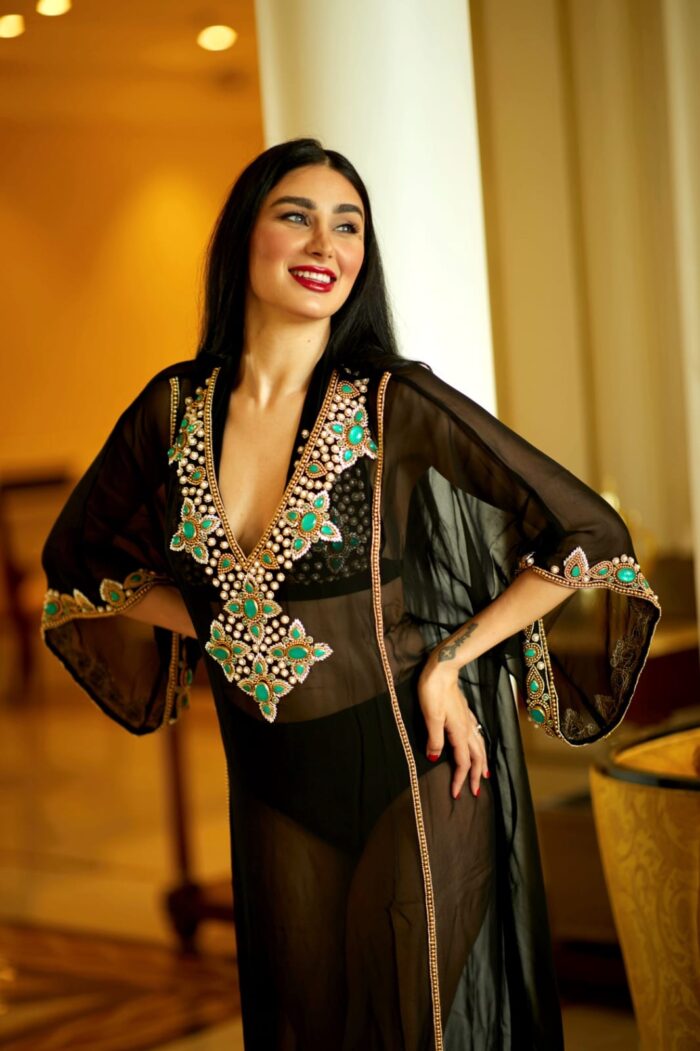Made in premium satin fabric adding to it the required texture and flow. Neck is fully hand embellished with crystals and beads. Great wear for resort, holiday and special occasions