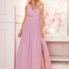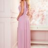 A long dress with a neckline, a leg slit and a tie at the back. Made of airy fabric in the color of powder pink. Fastened at the back with a covered zipper. Polish product. Brand numoco.