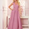 Long gown with neckline, leg slit and back tie. Made of airy fabric in powder pink with brocade. Fastened at the back with a covered zipper. Polish product. Brand numoco.