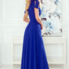 Long dress with neckline, leg slit and bows on the shoulders. Made of pleasant to the touch fabric in a fashionable cornflower color. Polish product. Brand numoco.