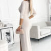 Glitter dress with envelope neckline and leg slit. Made of elastic material with glitter. Dress in beige color. Brand numoco. Polish production.