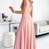 Long dress with neckline, leg slit and bows on shoulders. Made of pleasant to the touch fabric in the color of dirty pink. Polish product. Brand numoco.