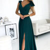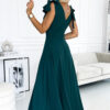 Long dress with neckline, leg slit and bows on the shoulders. Made of pleasant to the touch fabric in bottle green color. Polish product. Brand numoco.