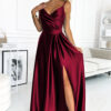 Chiara elegant maxi long satin gown with straps. Beautifully shaped neckline and slit on the skirt creates an unusual composition. Made of shiny, smooth, slightly stretchy satin in burgundy color. The dress is ideal for weddings, New Year’s Eve, proms, carnivals and other more important outings. Polish production. Numoco brand.