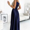 Chiara elegant maxi long satin gown with straps. Beautifully shaped neckline and slit on the skirt creates an unusual composition. Made of shiny, smooth, slightly stretchy satin in navy blue. The dress is ideal for weddings, New Year’s Eve, proms, carnivals and other more important outings. Polish production. Numoco brand.