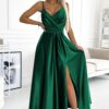 Elegant maxi long satin dress with leg slit. Beautifully shaped neckline and slit on the skirt creates an unusual composition. Made of shiny, smooth, slightly stretchy satin in green. The dress is ideal for weddings, New Year’s Eve, proms, carnivals and other more important outings. Polish production. Brand Numoco.