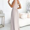 Long gown with neckline, leg slit and three-stitched waist. Made of stretch fabric with brocade in beige color. Ideal for weddings, christenings and other major events. Polish product. Numoco brand.