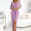 Glitter maxi long dress with envelope neckline and leg slit. Made of stretch fabric with glitter. Dress in the color of dirty pink. Brand numoco. Polish production.