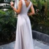 Long brocade maxi dress with deep neckline, wide straps and leg slit. The dress is beige in color with brocade. The dress beautifully exposes the neckline and fits perfectly for dancing. Fastened at the back with a covered zipper. Polish product. Brand numoco.