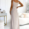 Elegant maxi long glittering strapless dress. Beautifully contoured neckline and slit on the skirt creates an unusual composition. Made of brocade stretch fabric in beige color. The dress is ideal for weddings, New Year’s Eve, proms, carnivals and other more important outings. Polish production. Numoco brand.