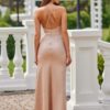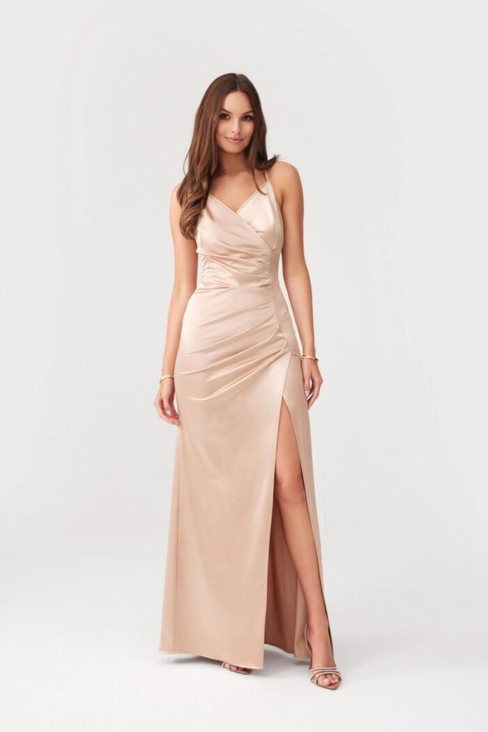 The Lamelia maxi dress with an open back is made of delicate and soft-touch fabric. The dress features a fitted cut and a draped neckline that cleverly connects to the back neckline. This is achieved by the straps that pass through the neckline and cross at the back. It is fastened at the back with a concealed zipper. The side slit adds a bit of edge to the dress, giving it character. The dress falls to the ankles, adding elegance and class. It has an elastic waist that beautifully accentuates the silhouette and ensures comfort when wearing. The product is manufactured and sewn in Poland.