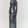 A maxi dress made of metallic material is an elegant creation that emanates radiance and charm. The draped sweetheart neckline is a subtle but striking detail that highlights the neck and shoulders, adding elegance and sensuality to the overall look. This neckline design gives the dress a more refined appearance and accentuates the natural silhouette. The long, slim sleeves combined with the rest of the dress create an elegant and cohesive look. The dress features a subtle side slit, adding sensuality and lightness to the entire outfit. As a result, it is not only elegant but also very feminine and comfortable to wear. The dress is designed in a fitted silhouette that emphasizes the waist and naturally shapes the figure, creating a slimming effect. With its elegant, shiny material and classic cut, this creation is perfect for evening outings, special events, weddings, or banquets. It is a timeless choice that will ensure you a stylish look in any situation. This elegant dress is perfect for special occasions that require elegance and class. Pair it with high heels and jewelry to create a striking outfit in which you will charm yourself and attract the attention of others.