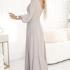 Nela is a spectacular, long dress that delights with its simplicity and at the same time extraordinary elegance. Made of high-quality material with a delicate sheen, it beautifully emphasizes the silhouette, guaranteeing comfort and freedom of movement. The model stands out with a wrap neckline that elegantly accentuates the silhouette, as well as a subtle slit on the leg, which adds lightness and femininity to the creation. The long sleeve is finished with a delicate elastic band, which ensures comfort and perfect dress placement during wear. The universal, beige color with a delicate glittery sheen makes Nela dress perfect for special occasions such as weddings, balls, proms, or elegant receptions. Thanks to its timeless cut, the creation beautifully falls during movement, providing comfort and full freedom of dance. The dress is fastened with a concealed zipper placed at the back. The product is made in Poland, from high-quality material, with attention to every detail.
