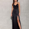 The long Alessandra dress with straps is made of elegant satin fabric that gracefully envelops the silhouette and accentuates its assets. The draped neckline and bold back lacing attract attention and ensure a unique and elegant character of the outfit. The maxi length and thigh-high slit add a touch of fierceness and mystery. The lacing at the back, besides the visual effect, allows for adjustment and customization of the strap length. The Alessandra dress is perfect for women who want to emphasize their femininity and appreciate bold and unconventional dress cuts. Alessandra is ideal for all kinds of occasions, such as prom, wedding, corporate party, New Year’s Eve.