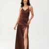The long Alessandra strappy dress is made of elegant, satin fabric that softly flows around the silhouette, emphasizing its attributes. The draped neckline combined with a striking tie at the back gives the whole outfit a distinctive yet elegant character. The maxi length paired with a thigh-high slit introduces a hint of sensuality and lightness. The adjustable lacing at the back not only attracts attention but also allows for the length of the straps to be adjusted to individual needs. Alessandra is a proposition for women who appreciate feminine, bold styles and want to stand out in an elegant way. It will work perfectly for special occasions such as prom, weddings, corporate events, or New Year’s Eve.