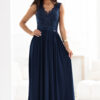 LEA is a unique evening dress by Numoco that combines elegance and modern style. The top of the creation is made of beautiful guipure lace with a V-neckline, subtly emphasizing the feminine silhouette. The back is adorned with transparent lace, and the flowing, flared bottom with a high slit adds lightness and a sensual character. Made in Poland from high-quality, elastic material, it ensures comfort and perfect fit. It is an ideal choice for a wedding, ball, prom, New Year’s Eve, or elegant gala. This navy blue long evening dress is a timeless creation that will work well for special occasions. Choose a lace maxi dress with a slit and feel like a star at any party.