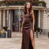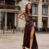 Dress Inez was made of pleasant to the touch, flowing satin, which gives the styling elegance and class. Its characteristic element is an asymmetrical neckline revealing one shoulder, adorned with a wide, ruffled strap. The fitted silhouette at the waist combined with a long, flowing skirt and a striking slit creates a silhouette full of grace and feminine charm. Model Inez is a combination of classic form with a modern accent, the unique cut attracts attention, while ensuring an elegant look. It will work perfectly for special events such as weddings, communions, proms or corporate events.