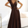 Shiny satin maxi dress by Numoco in a noble chocolate shade. The feminine line with a wrap neckline, subtle butterfly sleeves, and a slit on the leg beautifully shapes the silhouette and works great for dancing. Made in Poland. The chocolate satin color gives warmth and luxury to the styling, and the wrap neckline delicately accents the bust and neck. The front slit slims and adds lightness, making the dress look stunning both while dancing and in photos. This timeless maxi evening dress combines comfort with a spectacular look. Elegant satin maxi dress by Numoco in a chocolate brown color. The sensual V-neckline and slightly flared bottom give it elegance and feminine lightness. Perfect for a wedding, ball, or elegant reception. Made in Poland.