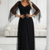 This brocade dress from the Numoco Basic line proves that you can have both. This is not just a little black dress, it’s a special occasion outfit. The deep, saturated black visually slims, and millions of sparkling particles ensure you won’t get lost in the crowd. Perfect when you want to walk into the room and just know you look great. This cut was designed with real female shapes in mind, not just mannequins. Why will you love this cut? The wide, draped belt acts like a soft corset, fantastically gathering the stomach and building hourglass proportions without uncomfortable pressure. The voluminous, tulle kimono sleeves are a masterful touch. They add lightness and elegance, while subtly masking the arms (so-called “wings”), giving you 100% freedom of movement. The V-neck wrap cut elongates the neck and beautifully showcases jewelry. Quality matters. The dress was made in European tailoring shops, guaranteeing straight seams and durable fabric. The elastic fabric works with the body in dance, instead of restricting it. Whether you wear size S or XXL – this dress will fit you flawlessly. Don’t wait for a special occasion to feel special. Order now and be ready for the WOW effect.