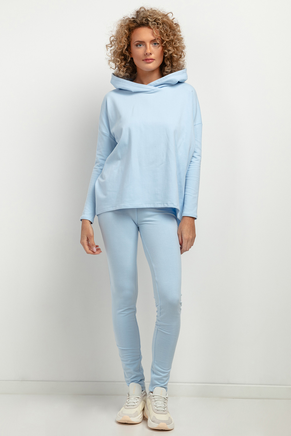 Adherent women’s leggings-style pants made of sweatshirt knit are comfortable and reliable for sports on autumn days or hectic life in the big city. The pants have a wide waistband and small darts at the back to accentuate the figure. The leggings are sewn from OEKO-TEX Standard 100 certified knit fabric.