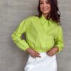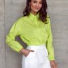 The shirt is buttoned at the front with an adjustable neckline. A classic stand-up collar adds to its charm. It is enriched with striking ribbing in the form of elastic at the bottom and at the wrists. The elastic at the bottom causes narrowing at the waist, which accentuates the waist and gently emphasizes the silhouette. The shirt is made of very good quality fabric and pleasant to wear, being a great complement to virtually any woman’s casual as well as formal styling. The product is manufactured and sewn in Poland.