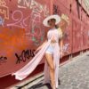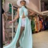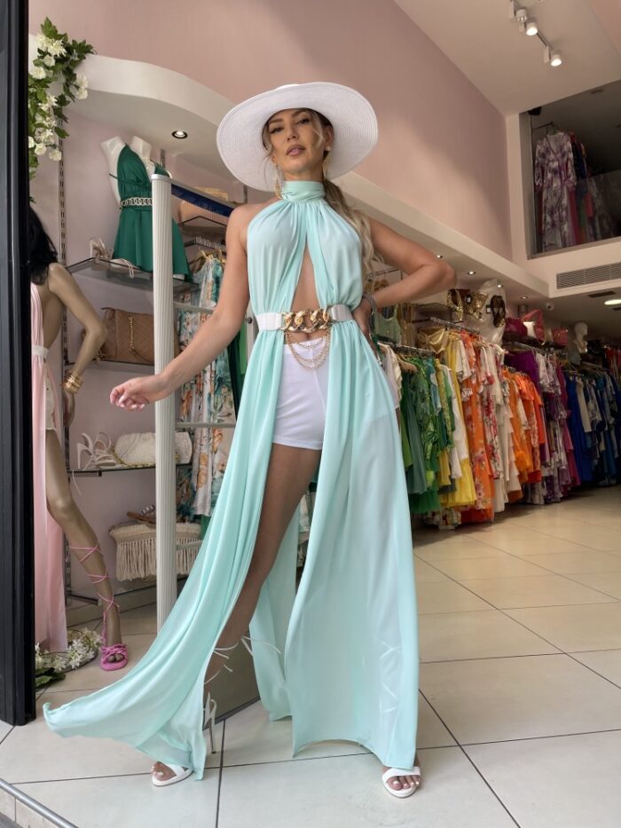 Unique and impressive baby blue maxi blouse-top with side slits! Ties at the neck, creating an opening between the breasts leaving the belly uncovered! Perfectly combined with the white high-waisted White Dream pants, for a complete set! Ideal for summer appearances on the island!
