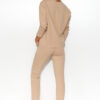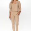 Elegant women’s tracksuit set. The minimalist blouse has a deep v-neck, long sleeves and interesting modeling stitching. A delicate patch with the letter M was sewn on the front. The women’s blouse looks extremely chic on the figure. Pants with a straight leg are its perfect complement. They also feature stitching, which gives the set a business chic look. On the sides, slip pockets are available. On the waist line, a thick elastic drawstring has been sewn into the pants. This makes the pants fit even better on a woman’s figure.