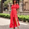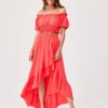 The asymmetrical blouse and skirt set is made of soft, pleasant fabric that will provide comfort to the most demanding women. The set includes a short top and an asymmetrical skirt. The top is characterized by beautiful exposed shoulders and frills at the waist and neckline. The skirt, on the other hand, impresses with a wonderful asymmetrical cut, ruffles at the front and an elastic waistband that will fit any figure. The summer set will perfectly suit any type of beauty, as it has a large range of colors. The product is made and sewn in Poland.