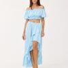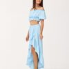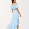 The asymmetrical blouse and skirt set is made of soft, pleasant fabric that will provide comfort to the most demanding women. The set includes a short top and an asymmetrical skirt. The top is characterized by beautiful exposed shoulders and frills at the waist and neckline. The skirt, on the other hand, impresses with a wonderful asymmetrical cut, ruffles at the front and an elastic waistband that will fit any figure. The summer set will perfectly suit any type of beauty, as it has a large range of colors. The product is made and sewn in Poland.