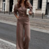 The women’s set is a stylish and comfortable combination of elegance with everyday comfort. The loose sweater with a V-neck and snap fastening provides freedom of movement and fits perfectly on the silhouette. The wide ribbing at the bottom adds structure and subtly emphasizes the waist. The long pants with wide legs are the epitome of comfort and class, with side slip pockets and an elastic waistband ensuring a perfect fit. Made of soft, pleasant to the touch material, the set will work both for everyday wear and in more elegant stylings. It can be worn together or combined with other wardrobe items, creating countless fashionable combinations.