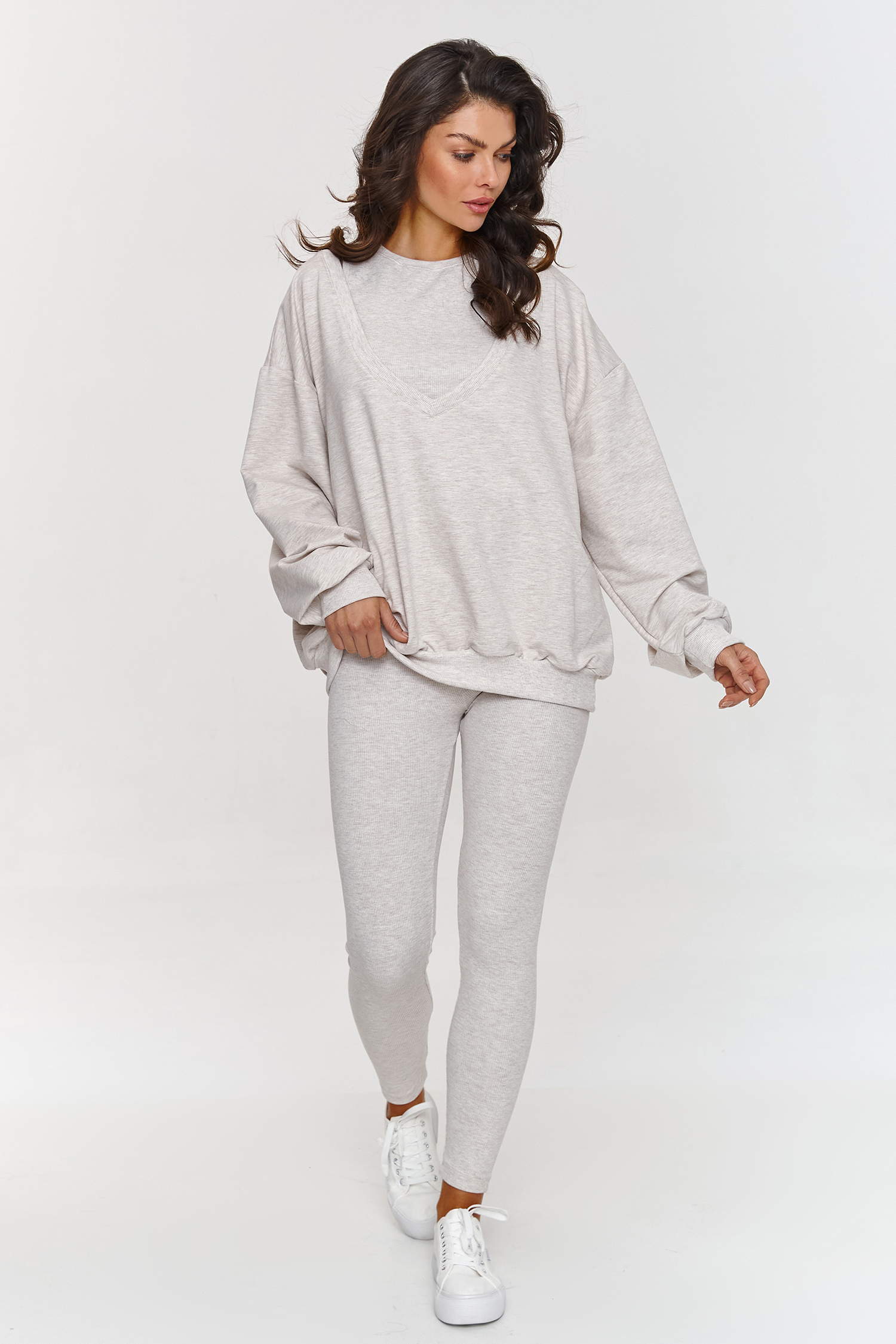 The tracksuit set is the perfect choice for women looking for comfort and style every day. The set consists of an oversized sweatshirt, a ribbed top, and leggings, which together create a cohesive, fashionable whole. Fitted, ribbed leggings beautifully emphasize the silhouette, providing comfort and comfort at the same time. The fitted top and loose-cut sweatshirt with a deep V-neck perfectly balance the whole and add feminine charm. The material is soft and pleasant to the touch, perfect for everyday wear. The combination of a classic sweatshirt with a top and ribbed leggings gives the styling a slightly sporty character. Thanks to its versatility, this set pairs perfectly with white sneakers, creating a comfortable everyday outfit. Were you looking for a set that combines elegance with comfort? The tracksuit set with a top and leggings is a must-have in your wardrobe! It is the perfect combination of comfort, functionality, and trendy design. Suitable for various occasions, from relaxing at home, to meetings with friends or walks in the park. Choose our set, which will add confidence and make you feel comfortable in every situation!