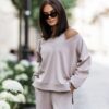 Stylish women’s set created with comfort and feminine look in mind. It consists of three perfectly fitted elements. A long-sleeved blouse with a V-neck that subtly emphasizes the neckline. The bottom of the blouse is asymmetrical, slightly longer at the back, giving the whole a modern character and ensuring freedom of movement. A tank top with a classic, round neckline, serving as a versatile base for many stylizations, perfect for wearing solo or under a blouse. Long pants with a comfortable elastic waistband and additional lacing for individual adjustment. Inset pockets increase functionality, while the slightly flared legs give lightness and fit into a fashionable, casual style. A perfect set for everyday wear, combining comfort with feminine aesthetics. It will work great both in the comfort of your home and in more relaxed, urban stylizations.