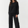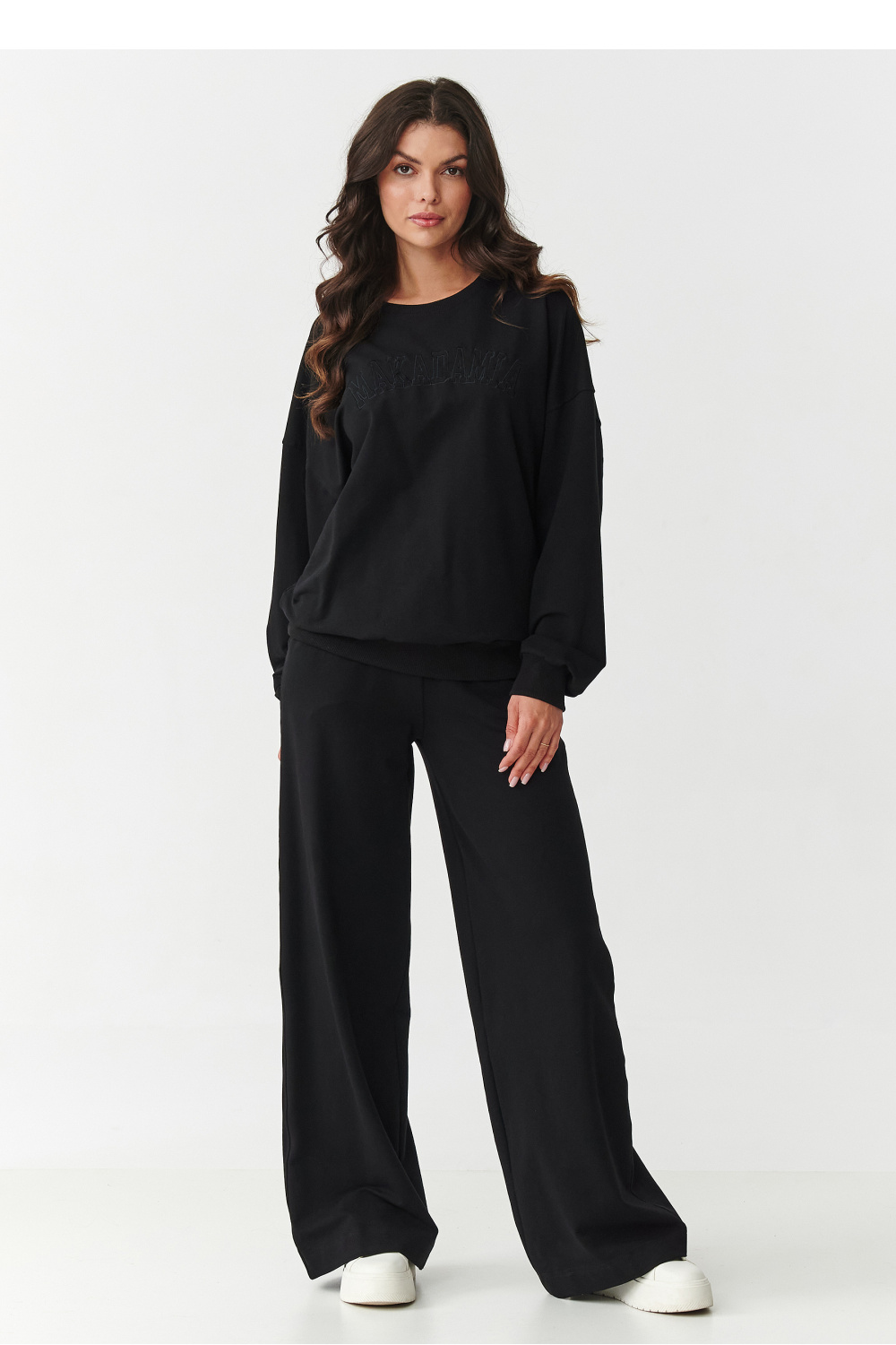 Choose a combination of comfort and a fashionable look with a women’s tracksuit set, which will be perfect for everyday wear, as well as casual outings or relaxing at home. Made of soft, breathable fabric consisting of 95% cotton and 5% elastane, it guarantees comfort and great fit without restricting movement. The top part of the set is a classic sweatshirt with a round neckline and slightly dropped shoulder line. It has a slightly oversized cut that gives the outfit a casual and modern character. Its uniqueness is highlighted by the embroidered logo application on the front, which adds originality and subtle style to the whole look. The pants stand out with a trendy cut with wide legs, which beautifully move with the body and give the silhouette lightness and balance proportions. An elastic waistband and practical pockets increase functionality and comfort. An ideal choice for any season, tracksuit with wide legs and embroidery is a must-have in a woman’s wardrobe. Comfort, quality, and a fashionable look in one set!