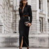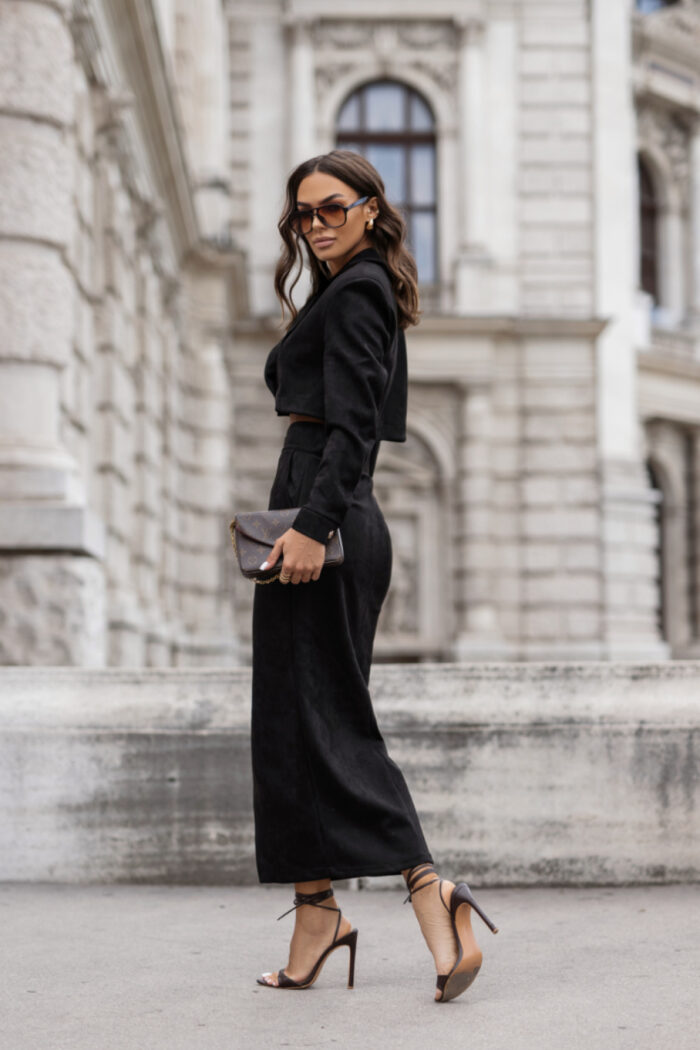 The WARRIS Black set is an elegant combination of style and comfort. Made of high-quality materials, it is perfect for various occasions, from everyday meetings to more formal events. The set consists of a blazer and a skirt, allowing for easy creation of trendy stylizations. The blazer features a classic cut that beautifully emphasizes the silhouette. It was designed with comfort in mind, made of 95% viscose and 5% elastane, making it both breathable and flexible. As a result, the blazer perfectly fits the figure, providing full freedom of movement. The skirt is a perfect complement to the blazer. It has a simple, yet elegant cut that highlights the feminine silhouette. With a universal knee-length, the skirt is suitable for both the office and important events. Made of the same high-quality materials as the blazer, it offers comfort throughout the day. Thanks to its styling, the WARRIS Black set allows for many arrangement possibilities. It is perfect for pairing with elegant heels for special occasions or comfortable ballet flats for everyday wear. A must-have in every wardrobe that will allow you to stand out in the crowd.