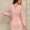 The unique mini dress is sure to grab attention at any occasion. The top of the dress is an overlapping V-shaped neckline, which also gently accentuates the back. The long, buffeted sleeves, which give the whole look classy and chic, are finished with an elastic band. The cut-off under the bust emphasizes and slims the waist, and the placed draping enhances the shape of the silhouette. The lower part of the dress is a fitted skirt characterized by a fashionable crease. Its length reaching above the knees and creases add delicacy and subtlety. The entire dress is fastened with a covered zipper at the back of the dress, making it easy to put on. Sarah dress has a lining. This model of dress is an excellent option as a complete styling, which will be perfect for various celebrations. The product is manufactured and sewn in Poland.