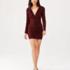 The fitted mini dress perfectly shapes the silhouette. The mini length exposes the legs, the V-neck subtly reveals and accentuates the bust and back. The cut under the bust emphasizes and slims the waist, and the draping highlights the shape of the silhouette. The long sleeves are the perfect complement to the whole and give the dress an unexpected form. Fastened with a hidden zipper at the back of the dress. The brocade mini dress with ruching is a complete outfit for a reception or party. The product is manufactured and sewn in Poland.