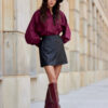 The Jackie skirt is made of a leather-like material, which is perfect for the autumn-winter season. The skirt was made in a trapeze shape, which looks good on any figure. The reinforced waist belt beautifully emphasizes the waist, and the mini length exposes the legs. An elastic band has been sewn into the back, which ensures a perfect fit and guarantees comfort. An additional asset of the skirt are pockets located on the sides. The skirt has a sewn-in lining. Jackie skirt will look great in autumn-winter styling with a voluminous oversize sweater and massive lace-up trappers, as well as in a more elegant look, combined with a shirt and boots on a pole. A large bag and a warm scarf will be a stylish complement to the whole look. The leather skirt is an excellent option for various occasions, from everyday meetings to elegant outings. The product is manufactured and sewn in Poland.